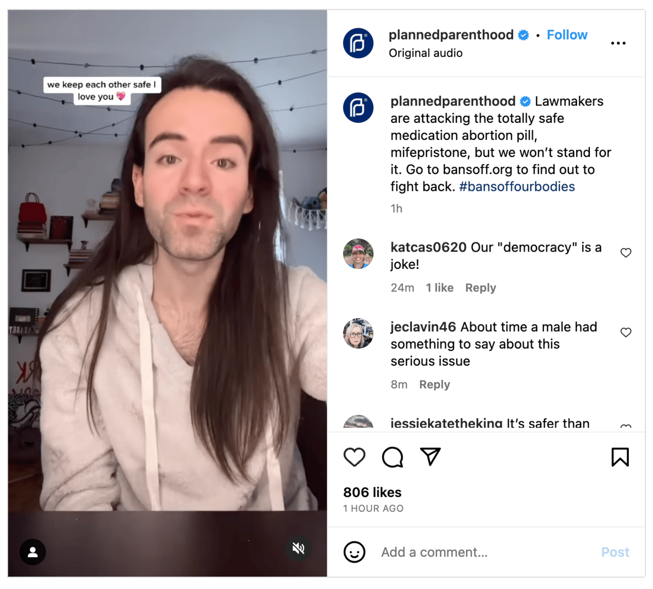 I don’t have any secret intel on this, and I guess it’s possible I’m totally wrong, but my understanding is that Planned Parenthood is hoping that viewers of their Instagram post will learn, retain, and appreciate the information it imparts and that they will share the post with other folks who will, learn, retain, and appreciate that information — and share it themselves. Maybe that is too obvious a statement to make? Clearly social media is a medium built for sharing (and the dream: virality). But once you get a little way down the path from PP Instagram followers to PP Instagram followers’ friends and their followers and their social media circles, you’ll run into the inevitable result that anyone who’s ever posted about abortion on social media has experienced: somebody trying to say boo.