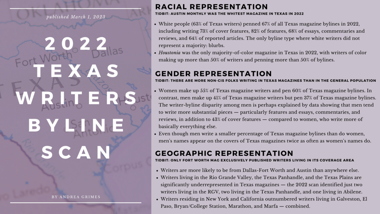 If you’re just curious about which Texas magazine editors told me (politely) to fuck off, which Texas print magazines feature the most diverse bylines, and how Texas magazine writers and editors have reacted to the scan so far — read on. (Though all of that is available in the report itself, too.)